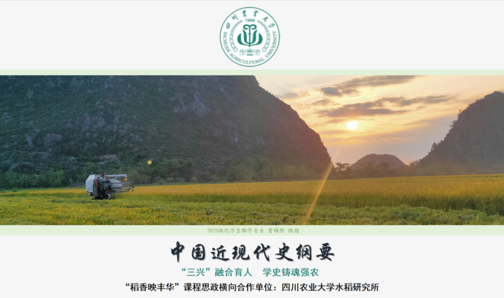 中国近现代史纲要课程团队坚持学习贯彻党的二十届三中全会精神,以科学的历史观方法论建构课程学理体系,积极探索涉农高校的思政育人路径,结合省情、校情凝练课程特色,全力打造“‘三兴‘’融合育人、学史铸魂强农”(注:“三兴”分别为:为实现中华民族伟大复兴、兴中华之农事、治蜀兴川)的课程品牌,培养学生学史明理、学史崇德、学史增信、学史力行,知农爱农,兴农强农,为我国新时代“三农”事业贡献自己的力量。| 课程章节 | | 文件类型 | | 修改时间 | | 大小 | | 备注 | |