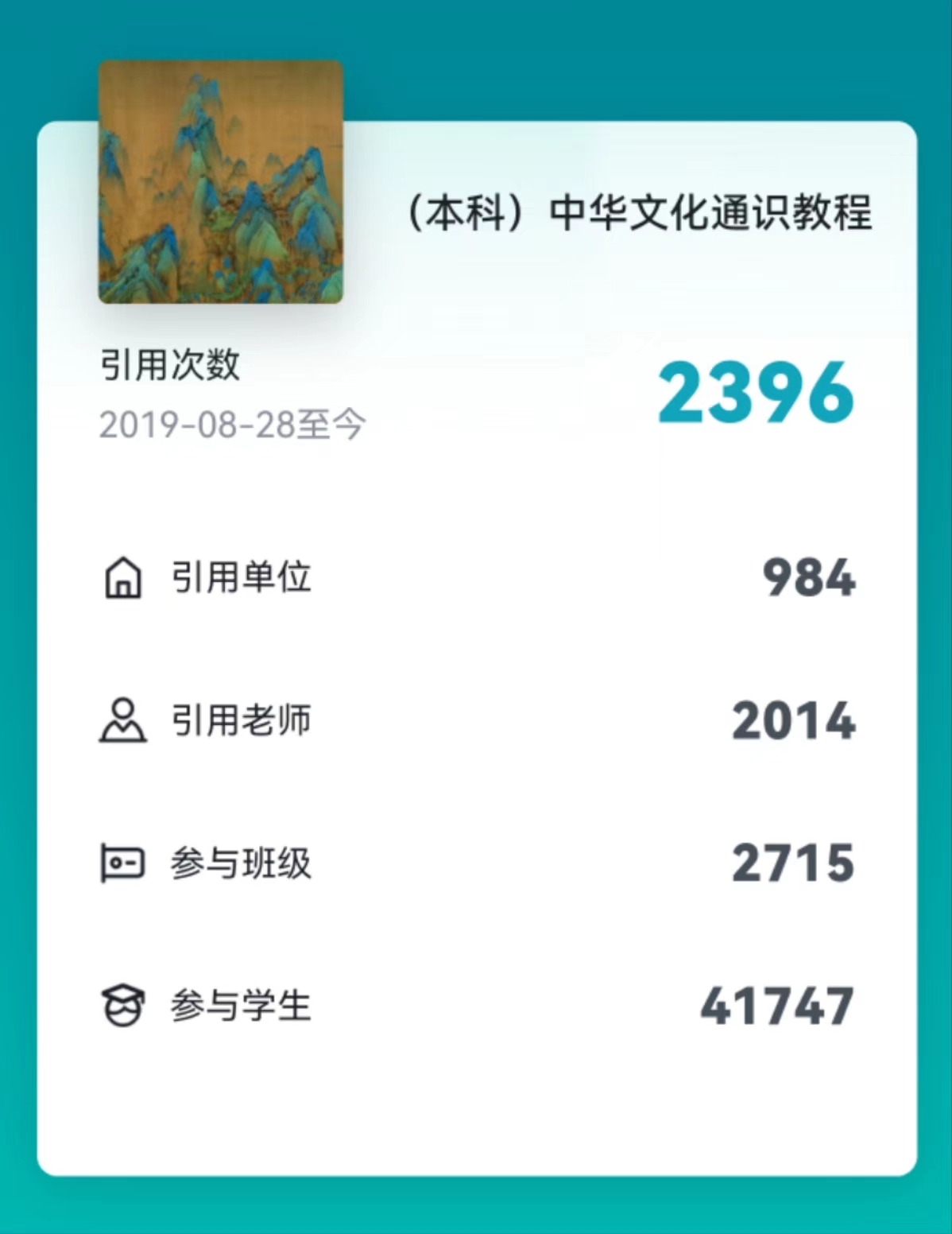 当前,全国共有5100余位教师引用MOOC《中华文化通识教程》示范教学包,课程引用率居超星全平台首位。学生受众尚未链入选课总人数。