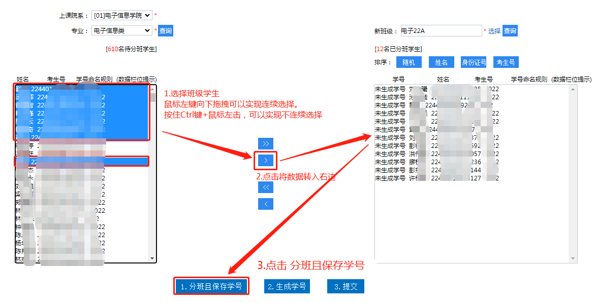 新生分班:选择学生从左侧(待分配班级)划入到右侧(已分配班级)所选班级。