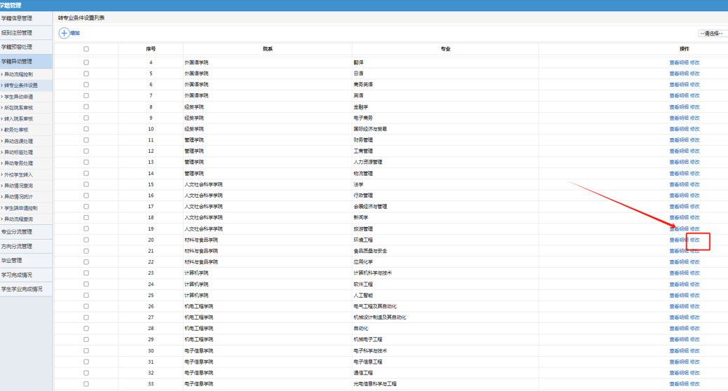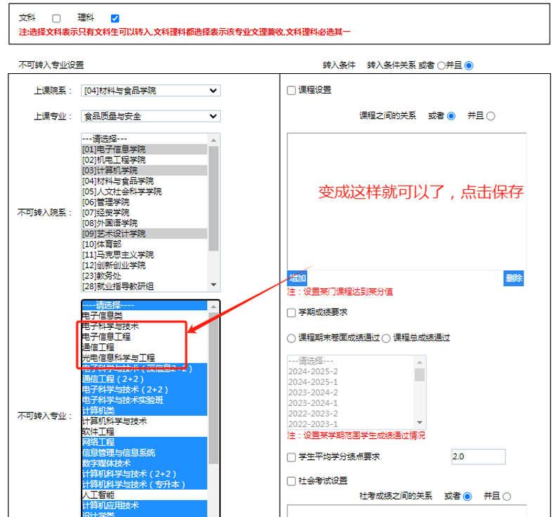 比如以下为食品质量与安全专业,不可转入艺术学院,就应该把艺术学院选上,进而把艺术学院不可转入的专业选上。由于这个专业是可以转入电子信息学院各专业的,以下设置不可转入电子信息学院的各专业就是不正确的。