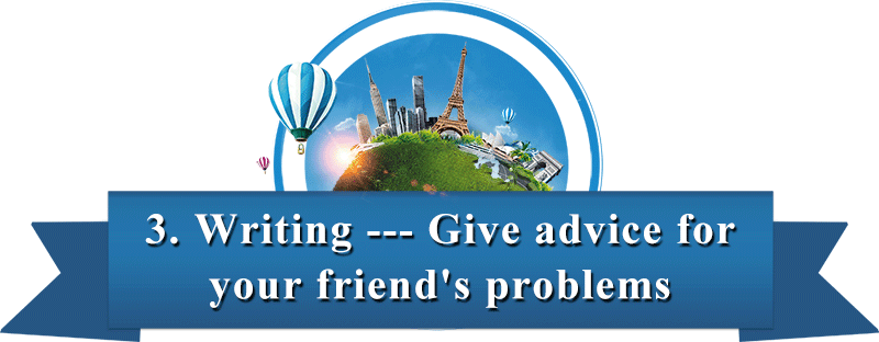 Part3 Writing 先带领学生根据所提示句型描写Tina的第一个问题或困难,并给出建议,并用if条件句来进一步说明自己提供的建议将会起到的作用。然后,让学生独立思考Tina的另外两个问题该怎么写,最后给出写作参考。