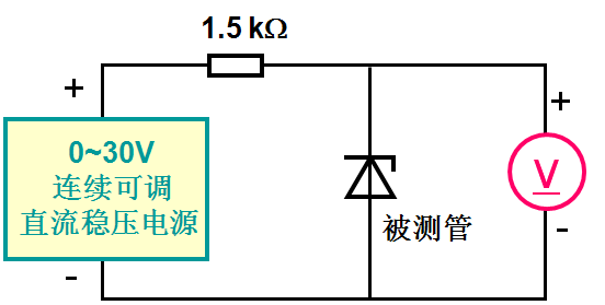 也可用兆欧表和万用表来测量二极管的反向击穿电压、测量时被测二极管的负极与兆欧表的正极相接,将二极管的正极与兆欧表的负极相连,同时用万用表(置于合适的直流电压档)监测二极管两端的电压。摇动兆欧表手柄(应由慢逐渐加快),待二极管两端电压稳定而不再上升时,此电压值即是二极管的反向击穿电压。
