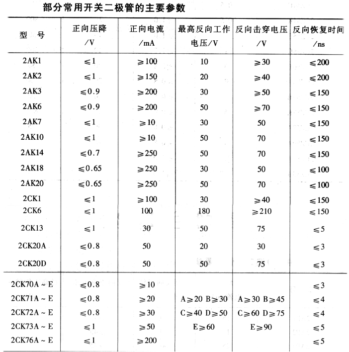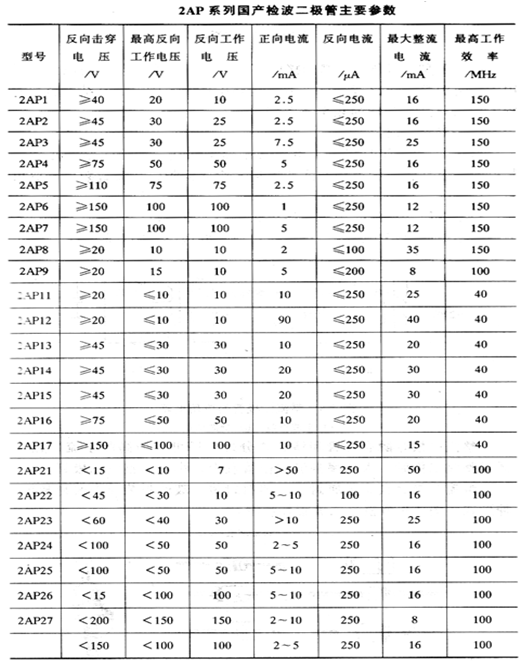 | 型号 | 反向 电压 | 最小正向电流/mA | 最小反向电流/mA | 平均整流电流/ mA | 浪涌电流 /A | 最小正向电压/V |