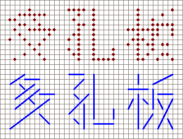 (1)在多孔板焊接面的上半部分用焊点设计自己的名字,如图左所示。要求:先在图右上用铅笔设计,每个字符之间横向、纵向所占的格数相等,字符与字符的间距相等。注:非常复杂的汉字可适当简化,如 “潘”、“蔡”、“霞”等。