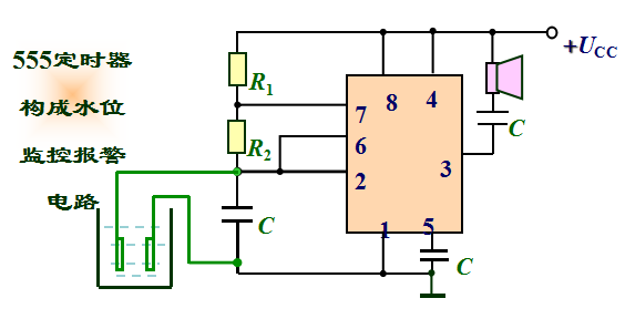水位正常情况下,电容C 被短接,扬声器不能发音;水位下降到探测器以下时,555定时器构成的多谐振荡器工作,驱动扬声器发出声音报警。