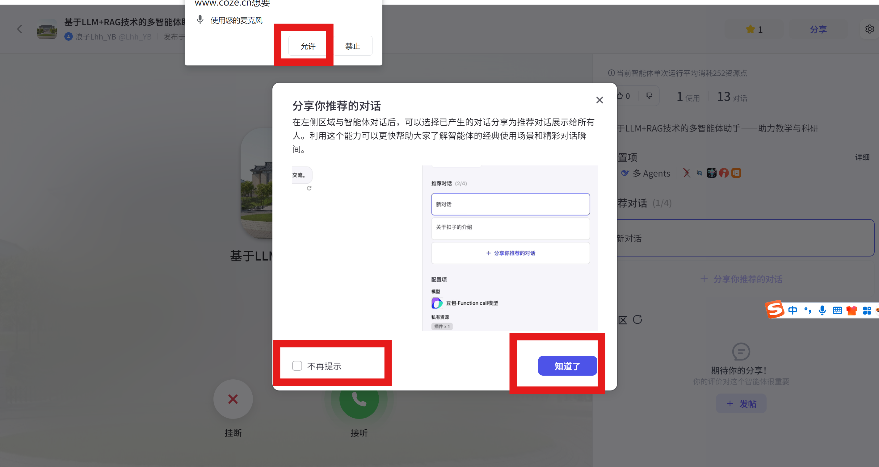 4. 由于智能体可以进行语音对话,因此出现以下界面,选择允许即可: