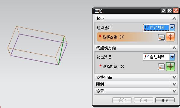 上图1,2两点,系统自动判断了一个平面,在支持平面内,也有平面选项,可以选择一个平面,但是这个平面会和之前确定的两点发生一定的关系。比如选择上表面,那么上图的效果会变成下图这样。