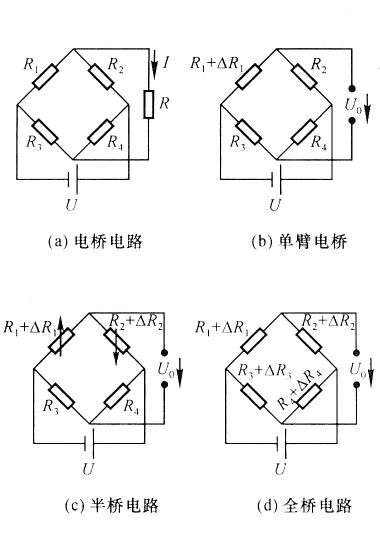 双臂电桥输出灵敏度是单臂电桥的两倍,全桥输出是双臂电桥的两倍,并且采用双臂和全桥测量,可以补偿由于温度变化引起的测量误差。