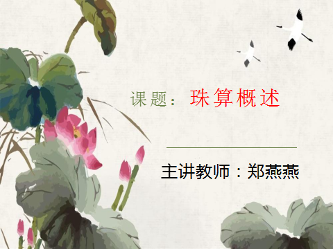 能力目标:通过本次课的教学,介绍珠算概述及基础知识,使学生明确珠算的发展史,以及正确运用基本的拨珠指法,并通过大量生动的事例培养学生对本课程的兴趣。