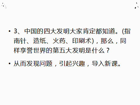 3、中国的四大发明大家肯定都知道。(指南针、造纸、火药、印刷术),那么,同样享誉世界的第五大发明是什么?-----算盘。