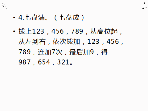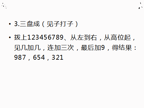 拨上123456789、从左到右,从高位起,见几加几,连加三次,最后加9,得结果:987,654,321