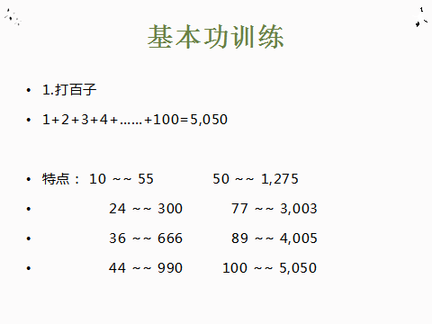 能力目标:通过巩固加法口诀,并进行趣味题的练习,以数字的形式美来提高学生的兴趣,并进一步巩固所学的内容,训练学生的指法基本功,要求熟练运用两指联拨和三指联拨,练习拨珠指法的正确性。