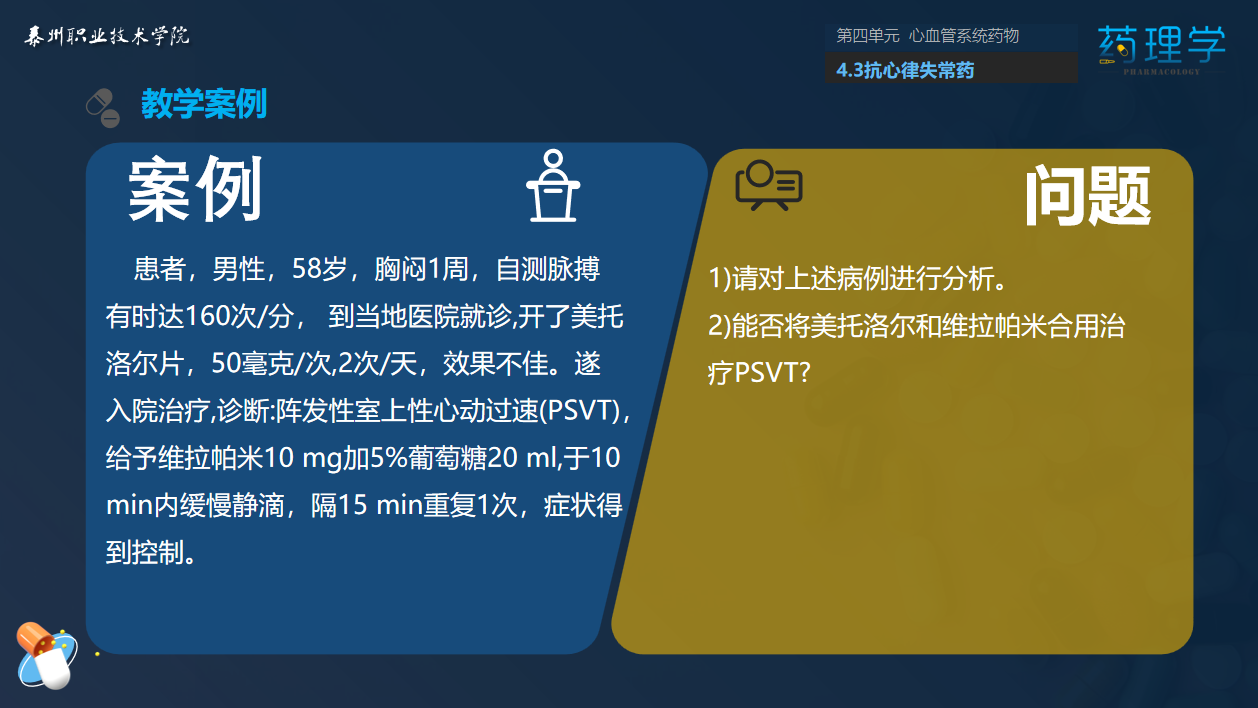 1.观看案例视频,分析用药史,学习抗心律失常药的分类和代表药