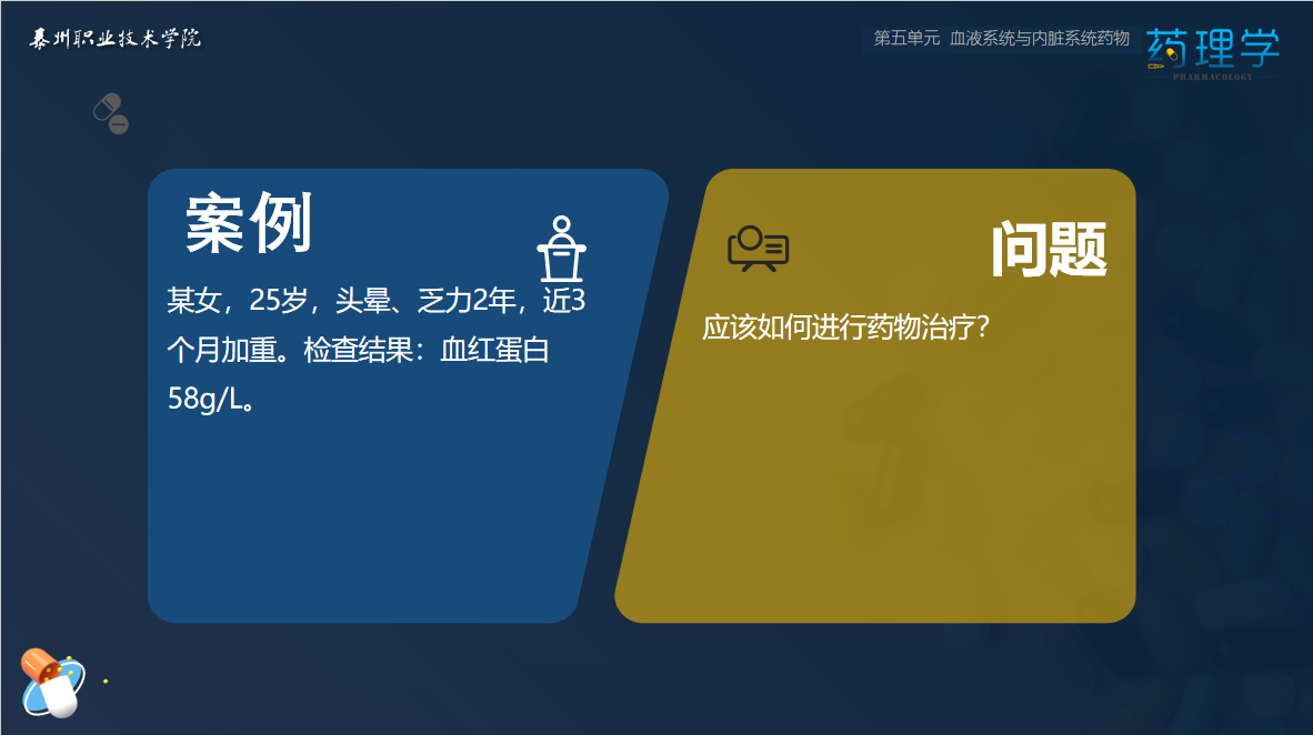 通过泛雅学习通《药理学》课程平台的课前自主学习,复习血液凝固过程,了解贫血的类型;通过课堂的学习讨论,能进一步掌握各类血液和造血系统用药的内容;通过课后的复习和作业,能进一步巩固并掌握本节课所有内容。