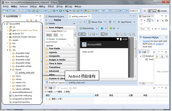 -layout子目录:存储Android程序的布局文件,创建项目后,默认创建一个activity_main.xml布局文件。