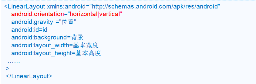 在XML布局文件中定义线性布局管理器,需要使用<LinearLayout>标记,其基本的语法格式如下: