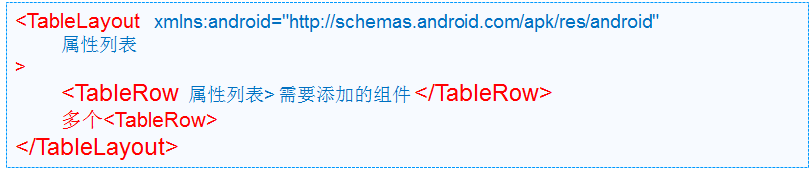 在XML布局文件中定义表格布局管理器的基本的语法格式如下: