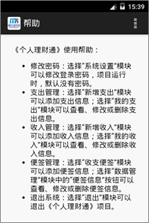 在Eclipse中创建Android项目,应用WebView组件加载使用HTML代码实现个人理财通的帮助功能。