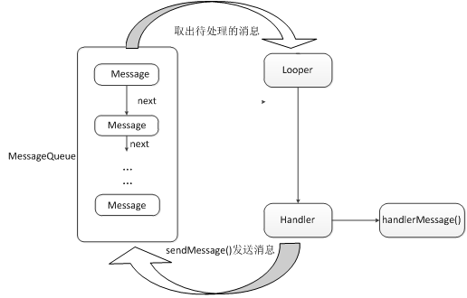 Looper是每个线程中的MessageQueue的管家。调用Looper的loop()方法后,就会进入到一个无线循环中。然后一发现MessageQueue中存在一条消息,就会将它取出,并传递到Handler的HandlerMessage()方法中。