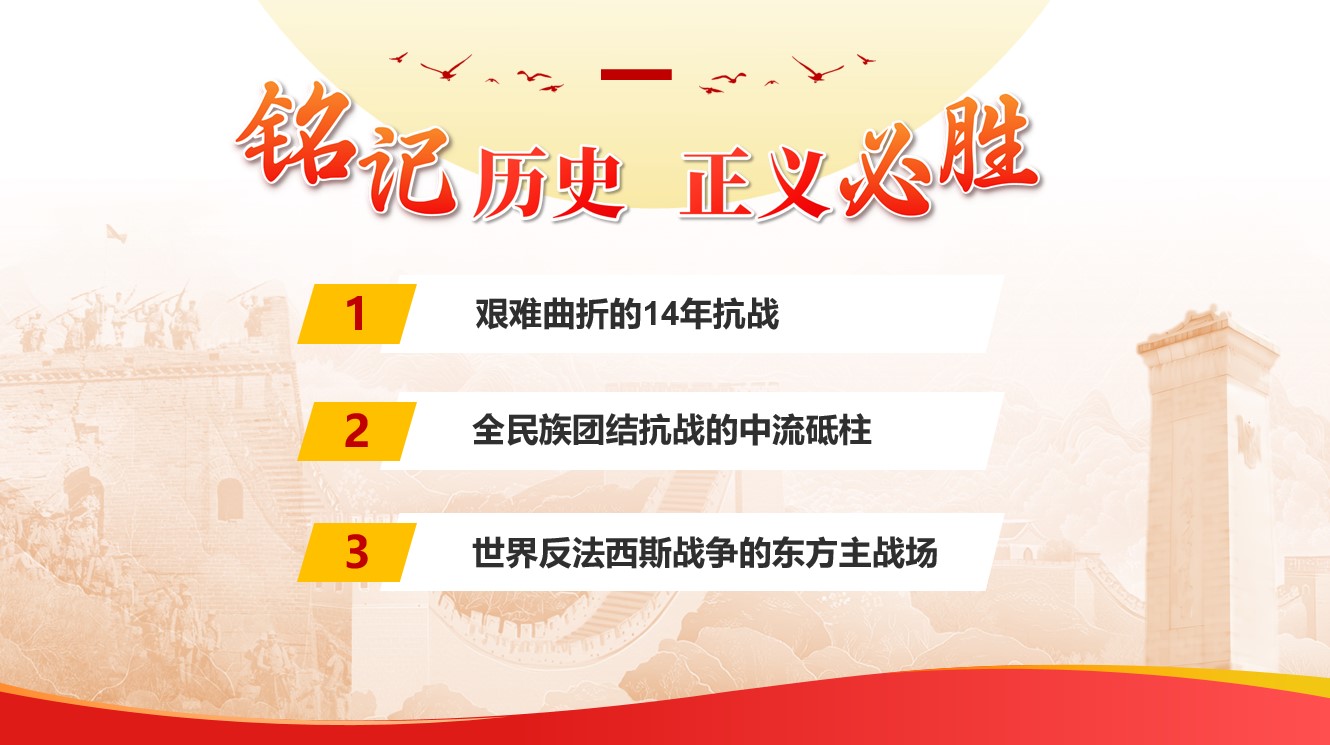 中国人民抗日战争和世界反法西斯战争,是正义和邪恶、光明和黑暗、进步和反动的大决战。在那场惨烈的战争中,中华儿女不屈不挠、浴血奋战,彻底打败了日本军国主义侵略者,捍卫了中华民族5000多年发展的文明成果,捍卫了人类和平事业,铸就了战争史上的奇观、中华民族的壮举。