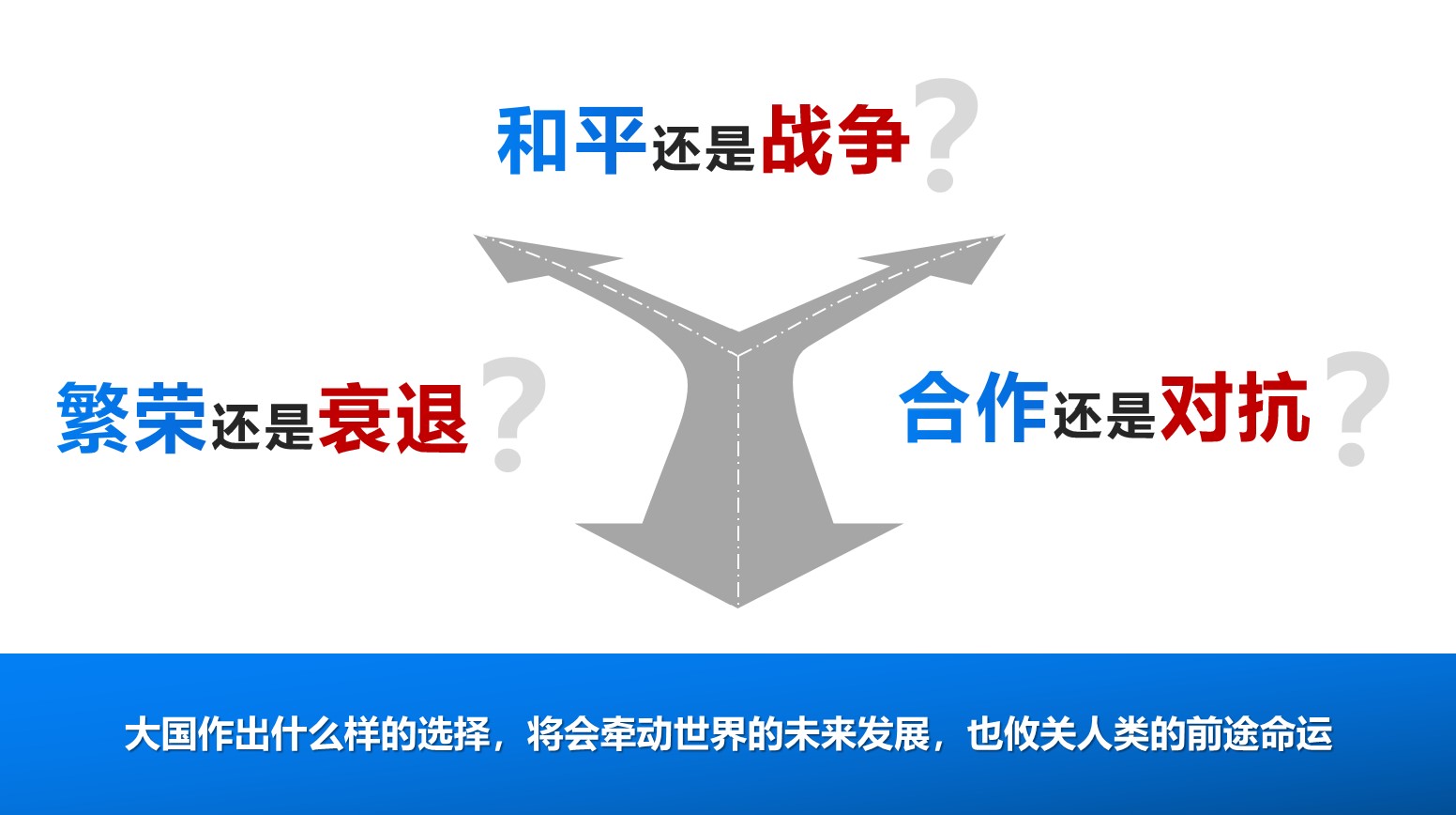 大国是维护世界和平稳定的重要力量,是构建新型国际关系的关键因素。大国之大,不在于体量大、块头大、拳头大,而在于胸襟大、格局大、担当大。当前,人类社会再一次走到历史的十字路口,和平还是战争、繁荣还是衰退、合作还是对抗?面对这些问题,大国作出什么样的选择,将会牵动世界的未来发展,也攸关人类的前途命运。