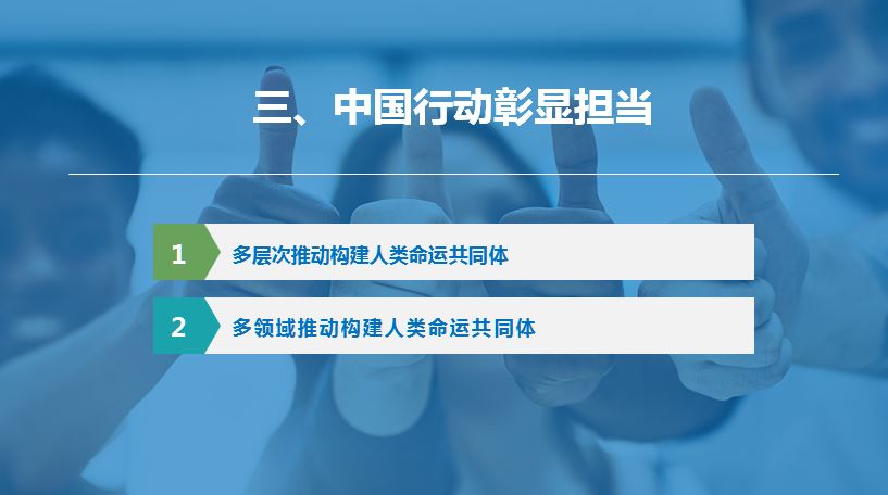 中国不仅是构建人类命运共同体的倡导者,更是实践者、贡献者和先行者。中国率先垂范,起而行之,用实实在在的行动赢得了世界的普遍认同与赞赏,生动践行了构建人类命运共同体的庄严承诺,极大地提高了人类命运共同体理念的说服力和感召力。