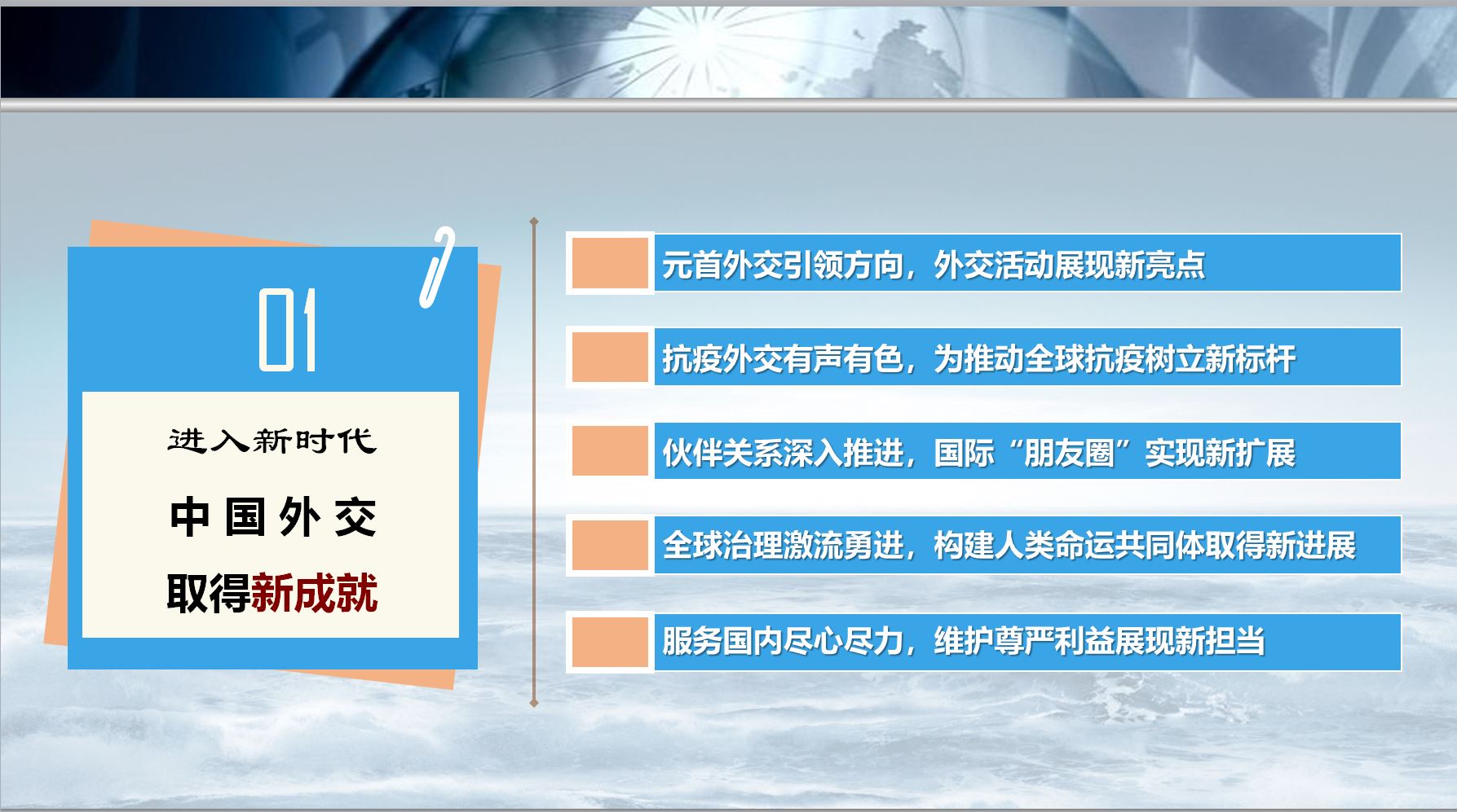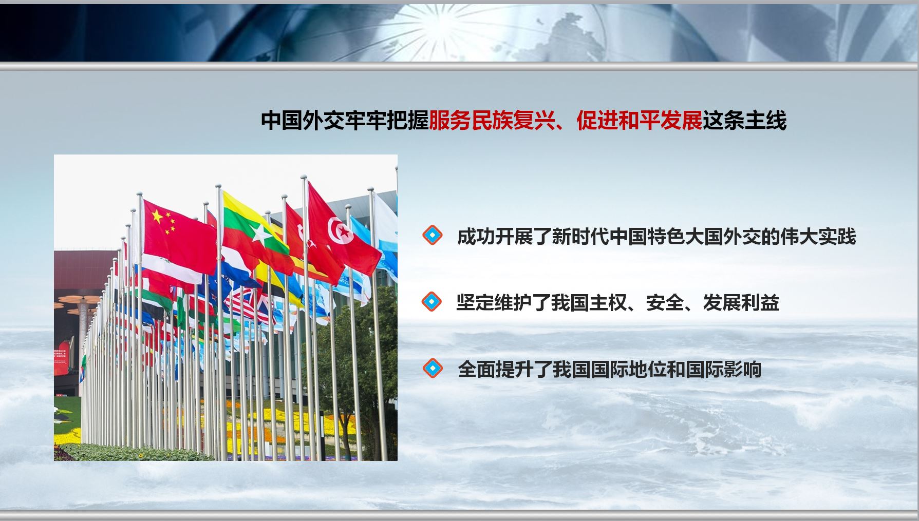 党的十九大以来,国际形势风云激荡,中国发展砥砺前行。中国外交牢牢把握服务民族复兴、促进和平发展这条主线,在世界乱局中化危为机,在国际变局中开创新局,成功开展了新时代中国特色大国外交的伟大实践,坚定维护了我国主权、安全、发展利益,全面提升了我国国际地位和国际影响。
