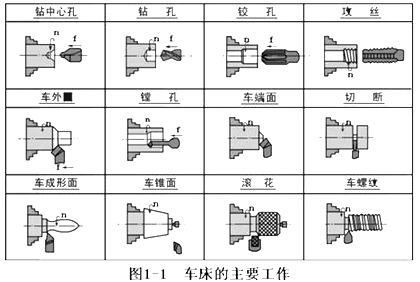 卧式车床在车床中的加工工艺范围最为广泛,它适用于加工各种轴类、套筒类和盘类工件上的各种回转表面,如车削内外圆柱面、内外圆锥面、环槽和成形回转表面;车削端面及各种螺纹;还可用钻头、扩孔钻和铰刀进行内孔加工;还能用丝锥、板牙加工内外螺纹以及进行滚花等工作。如图 1 一 1 所示为卧式车床上所能完成的典型加工表面。