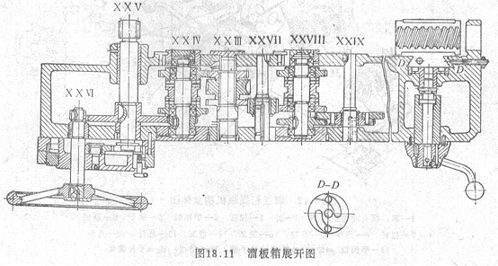 图18.11所示为CA6140型普通车床溜板箱展开图。表示溜板箱中各轴装配关系。