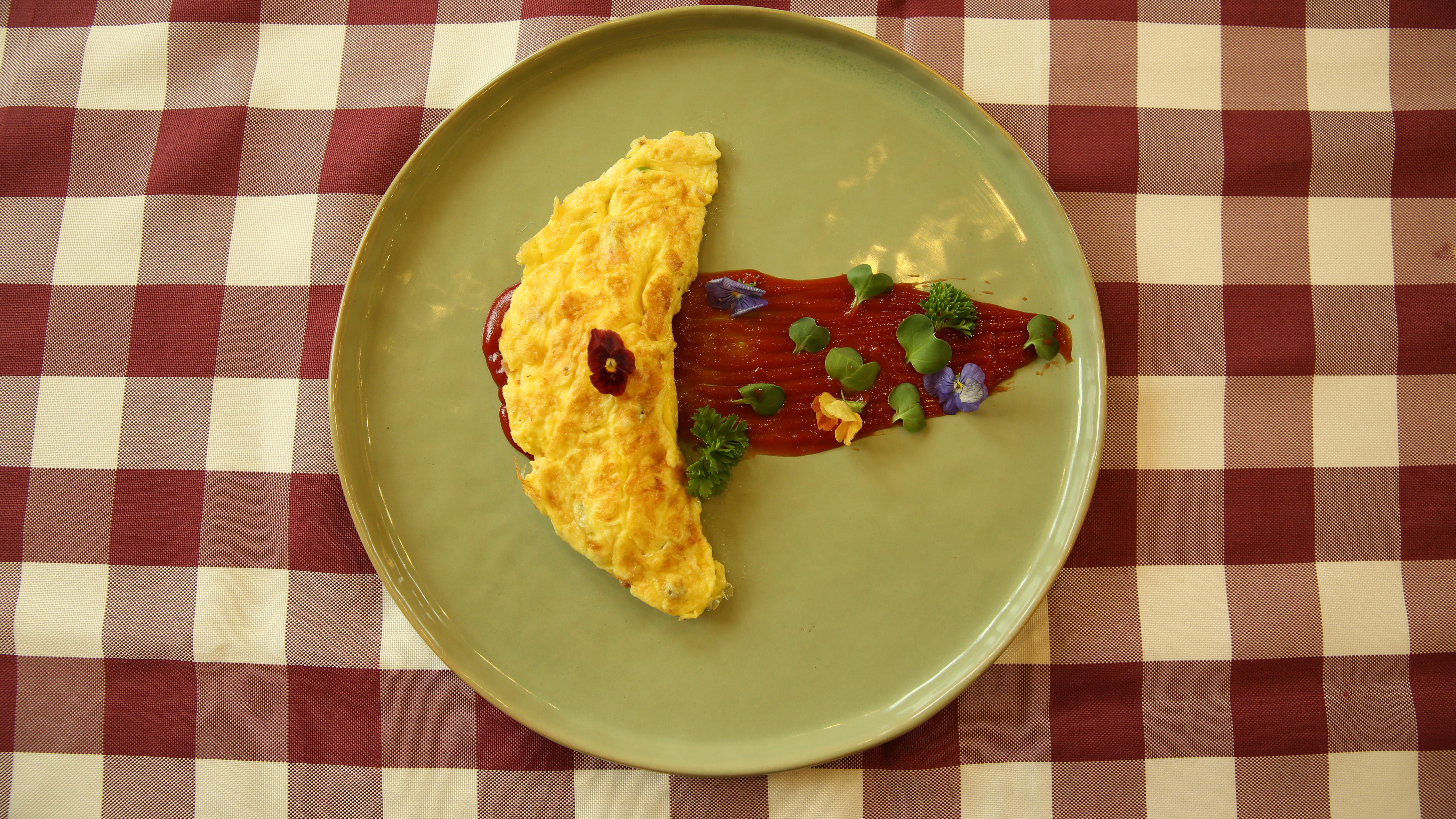 3.煎锅里加入色拉油炒洋葱碎、培根碎、口蘑碎、火腿碎、彩椒碎、番茄碎炒香后加入鸡蛋;在一面定型后加入芝士,并把鸡蛋卷起来。