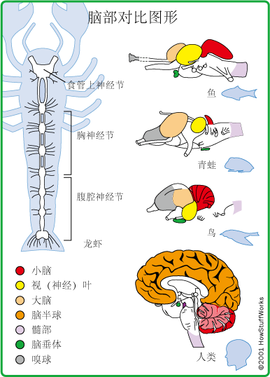 多数无脊椎动物(如龙虾)拥有多个简单“脑”,即由神经细胞聚集组成神经节。每个神经节都通过反射通路控制其对应节段的感觉和运动功能,同时神经节之间相互连接形成简单的神经系统。随着神经系统的进化,神经节链进化为更集中的简单脑。