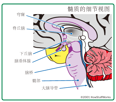 脑垂体——脑垂体含有控制脑垂体分泌激素的髓核。这些中枢支配有性繁殖、进食、饮水、生长、母性行为(如哺乳动物泌乳)。脑垂体还参与绝大多数行为,包括与日夜循环相关的生物“钟”(昼夜节律)。