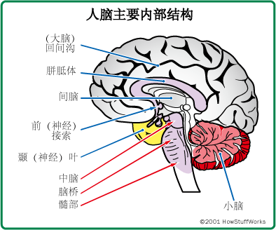 脑干——脑干由髓质(上端脊髓的膨大部分)、脑桥和中脑组成(低等动物只有髓质)。脑干控制反射、自动功能(如心率,血压)、肢体运动和内脏功能(消化、排尿)。