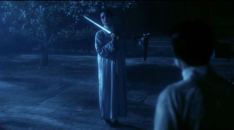 “汉兵已略地,四面楚歌声,君王意气尽,贱妾苦聊生”袁四爷与程蝶衣的那场对戏中也是以蓝色为主的,这场戏是他们两人媾和的开始,也是蝶衣在受到小楼结婚打击之后的堕落表现,蝶衣手中的那把剑通过反射原理发出幽蓝色的光,那是对小楼娶了菊仙的悲伤和绝望。