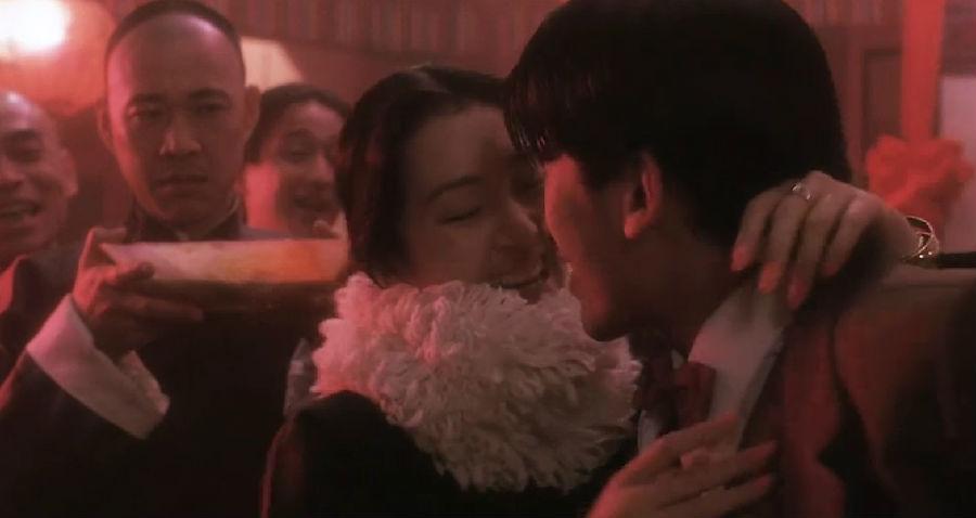 蒋雯丽演的小豆子的母亲,其实电影并没有明确的台词来说明她是一个妓女,但是在整个昏黄的画面里,从她的着装领口微开的墨绿色的旗袍,以及大红色的手帕,抹了红指甲油的手指,以及她头上戴的红花,虽然都只是局部的红色但在整体昏黄的画面里这些都是显得非常抢眼的,很醒目的表现出他是她是一个妓女的事实。