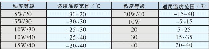在严寒地区冬季使用的发动机润滑油应选用0W、5W油或0W/20或5W/20多级油;而在炎热地区的夏季,则应使用40号油或20W/40等机油。常用发动机润滑油粘度等级与适用温度范围见表2-1。