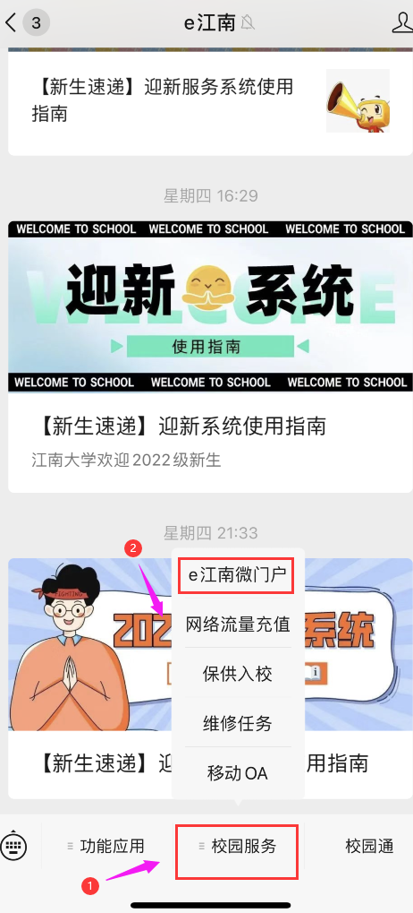 微信关注e江南微信公众号-【校园服务】-【e江南微门户】