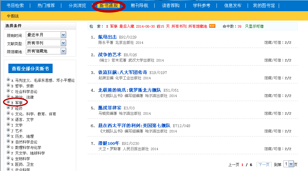 点击上方菜单栏中的“新书通报”按钮,即可帮助读者了解最近一天到一个月上架的新书信息。通过中图法的分类号对不同学科限制时间内的新书进行浏览,增加按文献类型查看的功能。