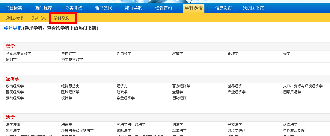 点击“学科导航”按钮,点选学科,即可检索到该学科下的热门书目。