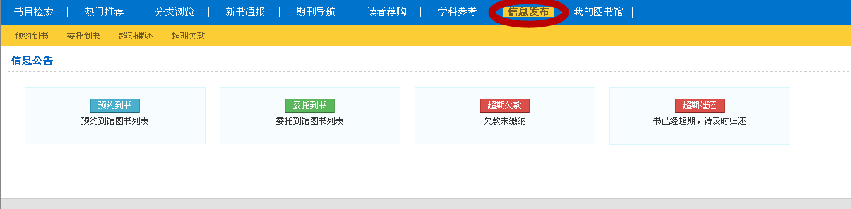 发布图书馆常规服务信息,如预约到书、委托到书、超期欠款、超期催还。