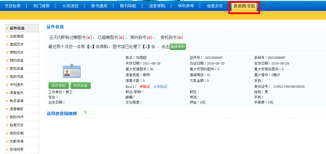 点击工具栏中的“我的图书馆”按钮,即可进入我的图书馆界面,可以查询到本图书证件的基本信息及适用的借阅规则。