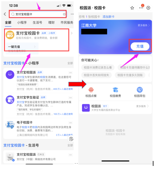 首先,点开支付宝APP。在最顶层的搜索栏中,输入“支付宝校园卡”,点击进入“校园卡”应用服务。