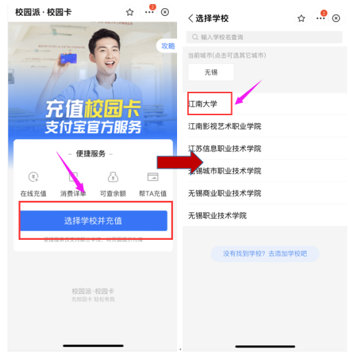 持卡人持校园智能卡至无锡工商银行江大支行(位于学校东大门行政楼一楼西侧)柜台进行人工充值。