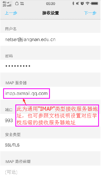 如果此处选择“IMAP”类型,学生和教职工均可使用通用接收服务器地址imap.exmail.qq.com,也可分别使用以下地址: