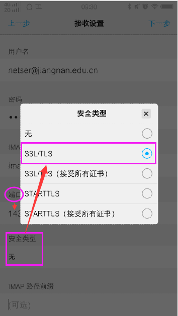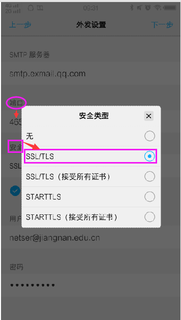 安全类型默认“无”,可点击选择相应类型,选择相应类型后,端口号自动填写默认值,无需修改。
