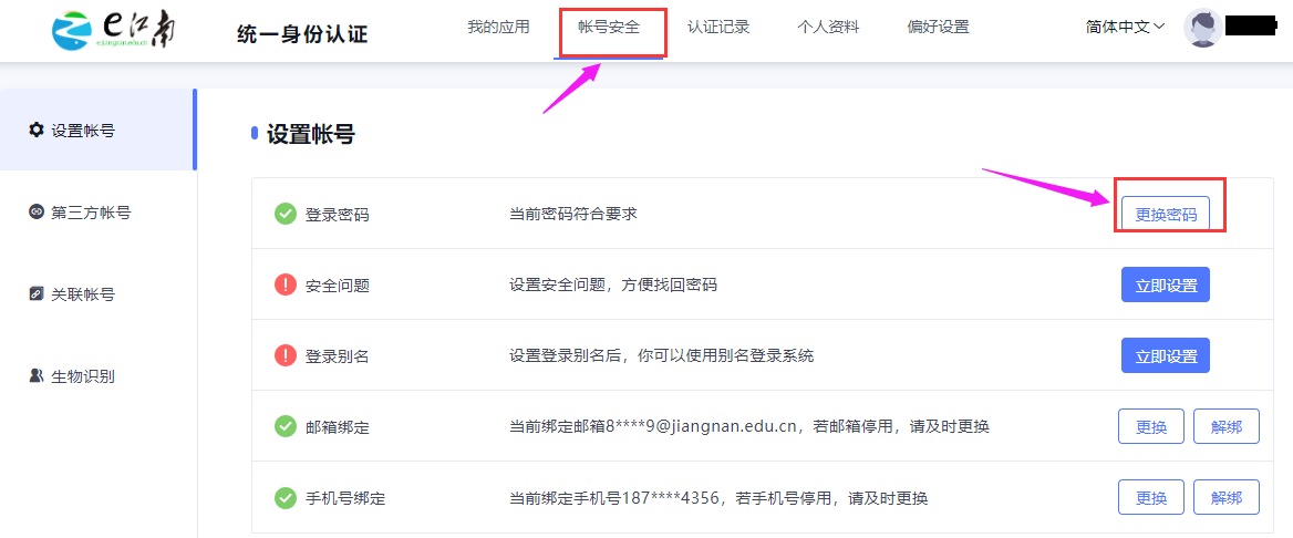 点击首页右上角设置-->个人中心-->更换密码-->选择手机会找回或邮箱找回。(注:手机号更换请及时到e江南个人中心更换新手机号)