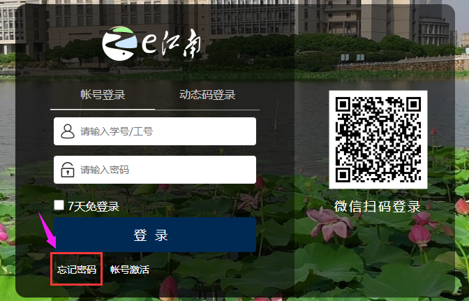 点击e江南门户登录页面的“忘记密码”,通过绑定的手机号或校内邮箱找回密码。