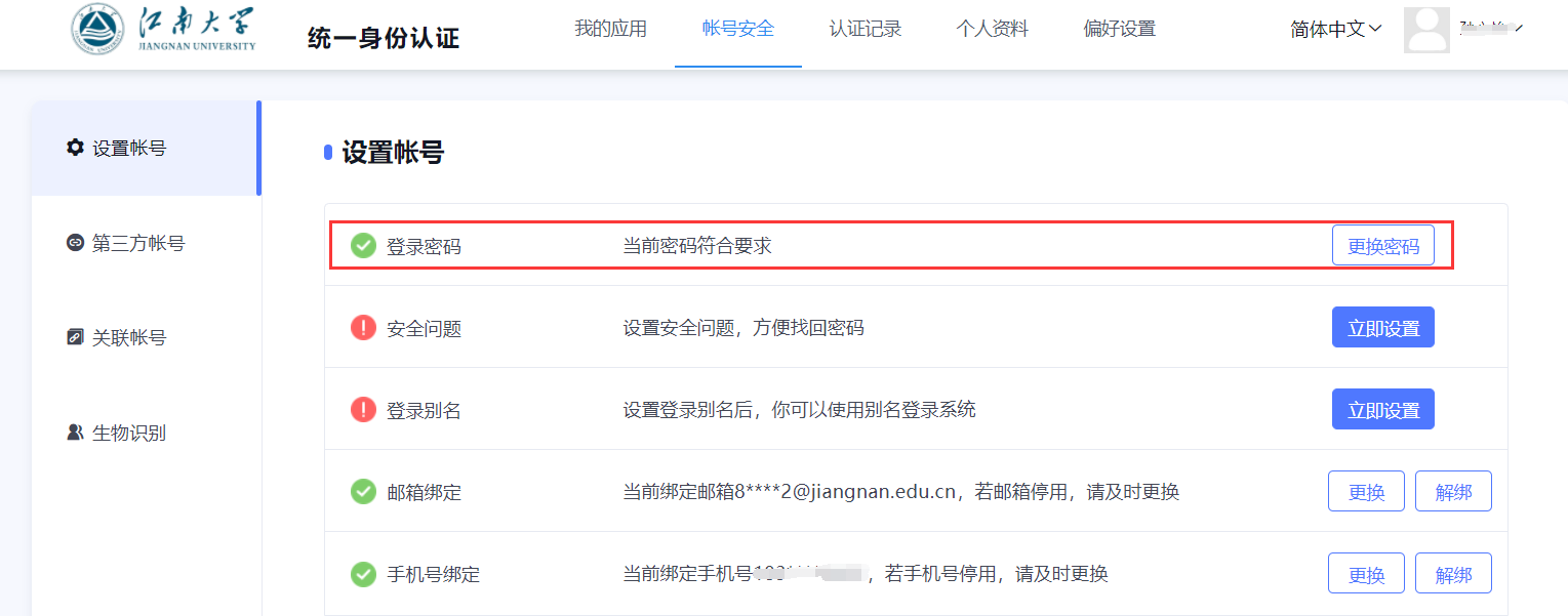 点开门户首页右上方个人姓名处,选择“个人中心”,进入统一身份认证后台更换密码