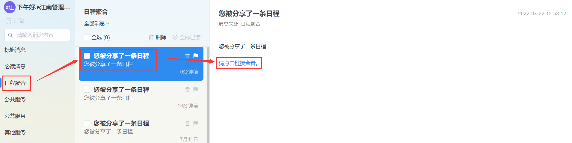 在日程下点击分享按钮,根据姓名或工号搜索想要分享的人员,确定后被分享人将在e江南门户—我的消息—日程聚合中看到分享信息,并添加到自己的日程中。