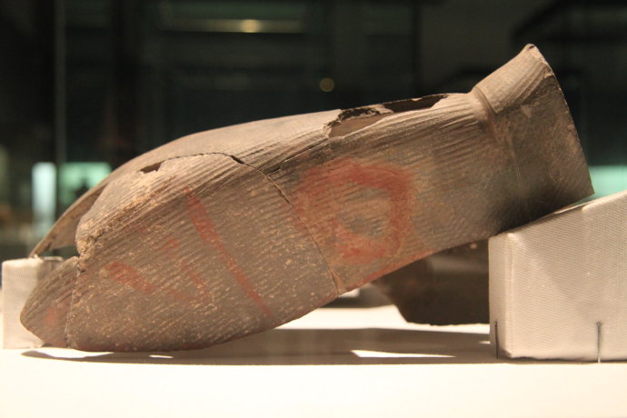1984年考古工作者在陶寺遗址中发现一片扁壶残片,残片断茬周围涂有红色,残片上朱书两个文字,其中的一个字为“文”,另外一个字专家们“尧”“易”“命”等多种解释。文字是人类社会发展到一定阶段的产物。关于中国文字的起源,大家公认甲骨文是初步定型成熟的文字系统,但同时也认为在甲骨文之前还有一段很长的历史。这个残片上的朱书文字表明,早在比殷墟早七八百年的陶寺时期,人们已经开始使用文字,它们的发现对于研究中国文字的起源有着重要的意义。